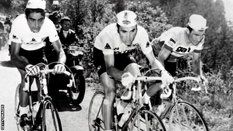 Luis Ocana, Eddy Merckx and Raymond Poulidor climb up Mont Vontoux in the 1972 Tour de France
